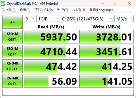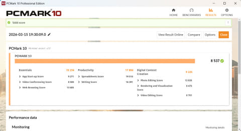 PCMark 10は、Web会議/Webブラウザ/アプリ起動の“Essentials”で4,100以上、表計算/文書作成の“Productivity”で4,500以上、写真や映像編集の“Digital Content Creation”で3,450以上が快適度の目安となっているが、すべての項目で2倍以上のスコアを出している。一般的な処理で不満を感じることは少ないだろう。