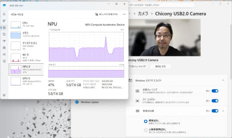 このNPUを活用するアプリが少ないのが長年の課題だったが、それは解消されつつある。定番なのがWebカメラと連動する「Windowsスタジオエフェクト」だ。自分が画面の中央になるよう調整する自動フレーミング、自分の目線がカメラに向いているように調整するアイコンタクト、背景のぼかしといった機能をCPU、GPUに負荷をかけずに利用できる。
