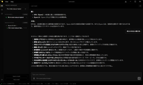 NPUとGPUの両方を使って処理を行なっているのが確認でき、日本語でのやり取りも可能だった。PC単体で完結できるためネットワークのない場所でも使える、情報漏洩といった不安のないローカルLLMでNPUが活用できる環境が整いつつある。