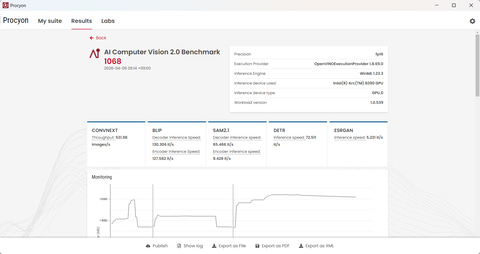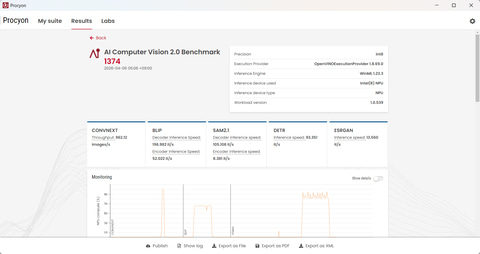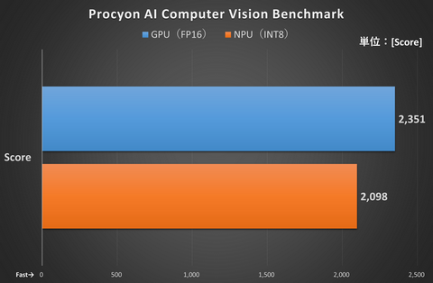 Procyon AI Computer Vision Benchmark 2.0は自動的に最適な精度が選択されるため、NPUがINT8、GPUがFP16となり単純な比較はしにくいが、低消費電力のNPUでGPUを上回るスコアを出しているのはさすがAI特化型といえるところ。