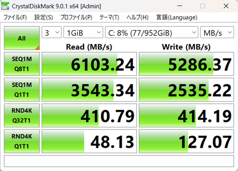 ストレージはPCI Express 4.0 x4接続のNVMe SSDで容量は1TBだ。シーケンシャルリードで6,103.24MB/s、ライトで5,286.37MB/sとかなり高速。多くの用途で不満を感じることはないだろう。