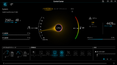 Core Ultraシリーズ3では、12コア、6コアなど幅広いラインナップを用意しているが、本機は16コア16スレッドの上位モデル「Core Ultra X7 358H」を採用。性能重視のPコアを4基、効率重視のEコアを8基、省電力のLP Eコアを4基という構成だ。最新のIntel 18Aプロセスで製造され、各コアとも設計が刷新され、性能、電力効率とも向上。大きな注目を集めているCPUだ。