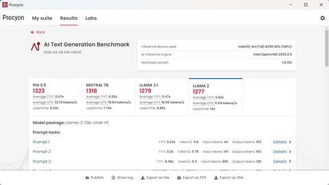 AI性能もチェックしよう。画像の分類や動画のアップスケーリングなどオフィスワークの実用性を踏まえた複数のAIモデルを実行する「Procyon AI Computer Vision Benchmark 2.0」とローカルLLMのパフォーマンスを測定する「AI Text Generation Benchmark」を実行する。