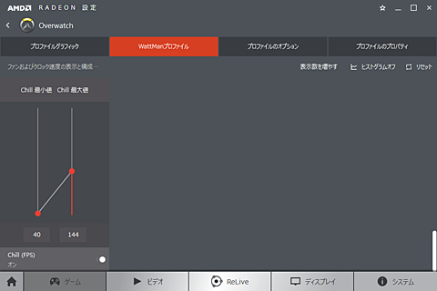 Radeon Chill対応タイトルである「オーバーウォッチ」で、その効果のほどを試してみた。オーバーウォッチの設定は、画面解像度1,920×1,080ドット、描画品質スタンダード。Radeon Chillは40~144fpsに設定している。