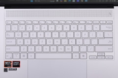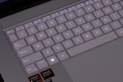 今回借用したのは英語キーボードを搭載するグローバル版だ。日本向けには日本語キーボード搭載モデルの発売も予定されている。グローバル版の英語キーボードはテンキーレス仕様で、各キーにはバックライトを搭載。16型ノートのゆとりあるスペースを生かして、主要キーのキーピッチは約1.9mmが確保されている。