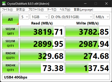 左側面に2基搭載しているUSB4ポートは、最大40GbpsでのUSB4接続に対応。今後普及が期待されるUSB4外付けSSDを接続すれば、最大で3.8GB/s前後の速度を発揮することが可能。