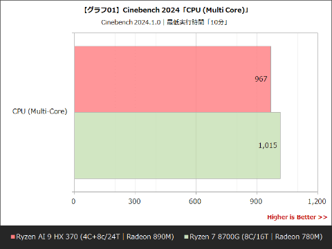 CPUのマルチスレッド性能を計測する「CPU (Multi Core)」では、967を記録したRyzen AI 9 HX 370が、1,015を記録したRyzen 7 8700Gを約5%下回った。最新設計かつCPUコア数で上回るとはいえ、電力リミット33WのRyzen AI 9 HX 370が、87.8WのRyzen 7 8700Gをマルチスレッド性能で上回るのはさすがに厳しいようだ。