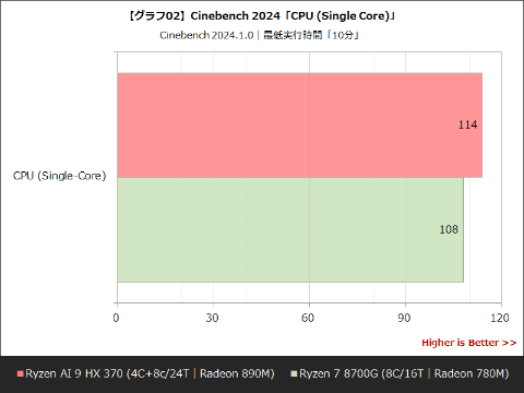 シングルスレッド性能を計測する「CPU (Single Core)」では、114を記録したRyzen AI 9 HX 370が、108を記録したRyzen 7 8700Gを約6%上回った。ここでは、最大5.1GHzで動作するZen 5コアを備えるRyzen AI 9 HX 370の強みが発揮された恰好だ。