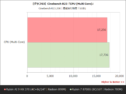 この条件でのスコアはRyzen AI 9 HX 370が「4,439」、Ryzen 7 8700Gが「3,714」だったので、Ryzen 7 8700Gを約20%上回るスコアを記録しながらも、消費した電力は半分以下ということになる。あくまでソフトウェア読みの消費電力を比較したもので実消費電力を比較したわけではないが、ノートPC向けにチューニングされたRyzen AI 9 HX 370の省電力性や電力効率が優れていることは間違いないだろう。