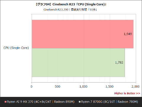 マルチスレッドテストでは、Ryzen AI 9 HX 370がRyzen 7 8700Gを約9%下回ったが、シングルスレッドテストではほぼ同等のスコアを記録している。