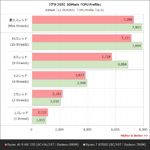 4スレッド以上が稼働する条件ではRyzen 7 8700Gを3~17%下回っているが、2スレッド以下になるとRyzen AI 9 HX 370が逆に7~11%上回った。