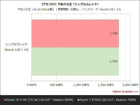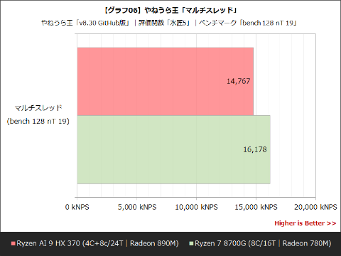 将棋ソフトの「やねうら王」では、ベンチマーク機能を利用してマルチスレッドテストとシングルスレッドテストを実行した。なお、Ryzen AI 9 HX 370で実行すると、そのままではシングルスレッドテストがZen 5cコアに割り当てられてしまい速度がでないため、シングルスレッドテストについてはZen 5コアに処理が割り当てられるよう調整している。