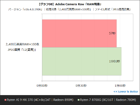 CPUとGPU両方を活用するこの処理では、57秒で処理を完了したRyzen AI 9 HX 370が、1分01秒を要したRyzen 7 8700Gを約6%上回る処理速度を発揮した。