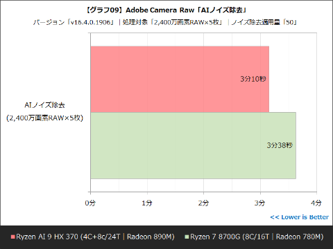処理のほとんどをGPUで実行するAIノイズ除去では、3分10秒で処理を完了したRyzen AI 9 HX 370が、3分38秒を要したRyzen 7 8700Gを約15%上回る処理速度を発揮した。