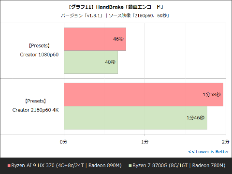 CPUとGPUのほか、ビデオエンジンを活用するこの処理では、1080p60と2160p60の両方を約3分で完了したRyzen AI 9 HX 370が、どちらも3分30秒弱を要したRyzen 7 8700Gを約13~16%上回る速度を発揮している。