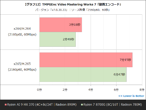 CPUコアをフルに使って動画エンコードを実行するこのテストにおいて、Ryzen AI 9 HX 370の処理速度はx264で約15%、x265で約6%、それぞれRyzen 7 8700Gを下回った。