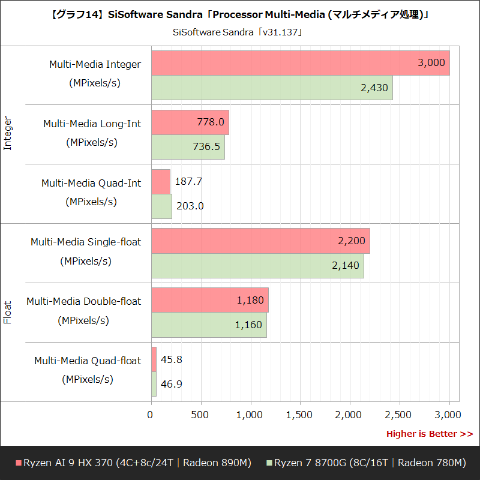 一方、Processor Multi-Mediaでは4倍精度演算(Quad-Int、Quad-float)こそRyzen 7 8700Gを2~8%下回っているものの、それ以外の条件では逆に2~23%上回った。