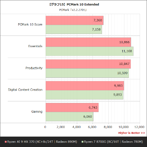 総合スコアで7,360を記録したRyzen AI 9 HX 370が、7,158のRyzen 7 8700Gを約3%上回った。サブスコアについても、EssentialsでRyzen 7 8700Gを約3%下回っているものの、ほかの項目では1~11%上回っており、特にGPU性能が重要なGamingでは最大のスコア差をつけてRyzen 7 8700Gを上回った。