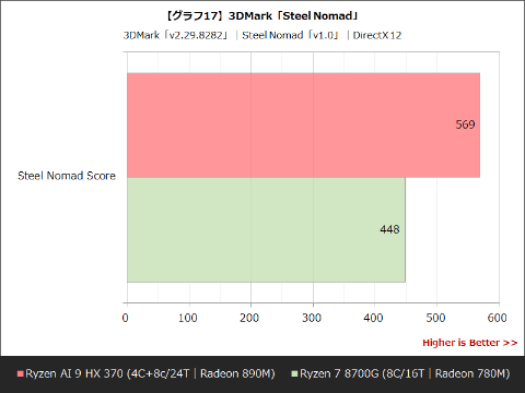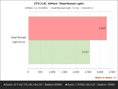 高負荷テストのSteel Nomad無印においてRyzen AI 9 HX 370が記録したスコアは「569」で、「448」のRyzen 7 8700Gを約27%上回った。軽量版のSteel Nomad Lightでも、「3,263」を記録したRyzen AI 9 HX 370が、「2,557」のRyzen 7 8700Gを約28%上回っている。