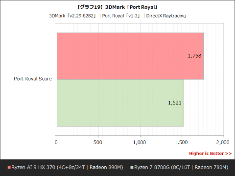 Ryzen AI 9 HX 370のスコアは「1,758」で、「1,521」のRyzen 7 8700Gを約16%上回った。