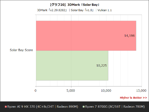 Ryzen AI 9 HX 370のスコアは「14,196」で、「10,225」のRyzen 7 8700Gを約39%上回った。