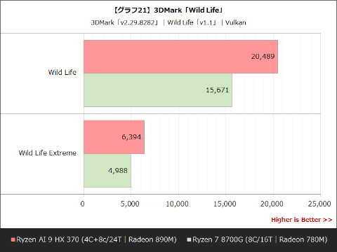 軽量なWild Life無印で記録したRyzen AI 9 HX 370のスコアは「20,489」で、「15,671」のRyzen 7 8700Gを約31%上回った。高負荷版のWild Life Extremeでも、「6,394」を記録したRyzen AI 9 HX 370が、「4,988」のRyzen 7 8700Gを約28%上回っている。