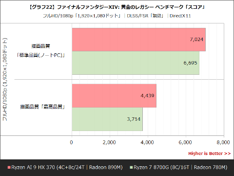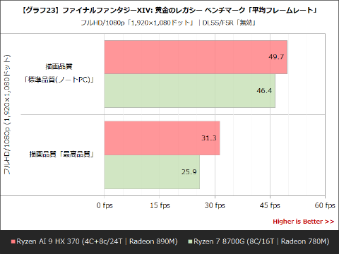 Ryzen AI 9 HX 370は「標準品質(デスクトップPC)」で約5%、「最高品質」で約20%、それぞれRyzen 7 8700Gを上回った。特にGPU負荷が高くなる「最高品質」で差を広げている様子から、GPUコア性能の差が表れた結果であると言えよう。