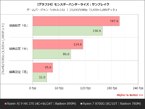 Ryzen AI 9 HX 370は描画設定「低」で197.6fps、「中」で114.8fps、「高」で45.6fpsを記録しており、Ryzen 7 8700Gを25~43%の大差で上回った。