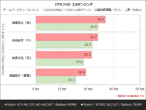 Ryzen AI 9 HX 370は描画設定「低」で40.1fps、「中」で35.7fps、「高」で32.3fps、「最高」で28.9fpsを記録しており、Ryzen 7 8700Gを10~25%上回った。残念ながら60fpsには届いていないが、30fpsは超えているのでプレイできないこともないといったパフォーマンスだ。