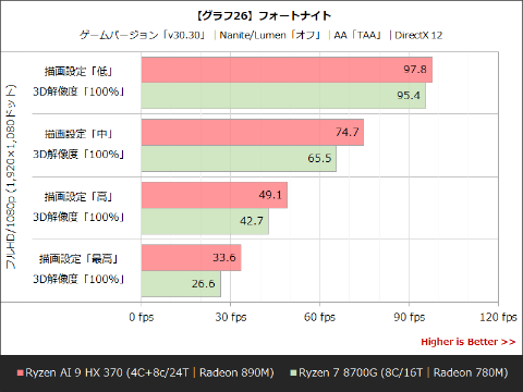 Ryzen AI 9 HX 370は描画設定「低」で97.8fps、「中」で74.7fps、「高」で49.1fps、「最高」で33.6fpsを記録しており、Ryzen 7 8700Gを2~26%上回った。