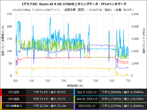 フルHD/1080pかつ「最高品質」設定で実行した「ファイナルファンタジーXIV: 黄金のレガシー ベンチマーク」のモニタリングデータが以下のグラフ。