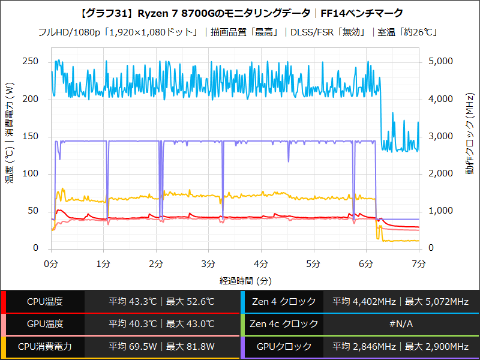 CPUのマルチスレッド性能でもRyzen 7 8700Gにかなり近いパフォーマンスを発揮し、シングルスレッド性能やGPU性能の優秀さが確認できたところで、Cinebench 2024「CPU (Multi Core)」と「ファイナルファンタジーXIV: 黄金のレガシー ベンチマーク」実行中のモニタリングデータを確認してみよう。