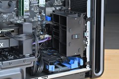 また、下の写真を見ると分かるが、 マザーボードは独自設計で、電源ユニットから出ているかさばりがちな24ピンコネクタがない。そのため、ケース前面からのエアーフローを遮る要素が排除されている。