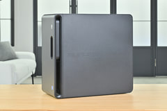 フロントパネルにもType-C(10Gbps)ポート1つに、Type-A(5Gbps)ポート3つが設けられている。コンパクトな筐体なので背面側のポートも比較的利用しやすいが、SDカードスロットやUSBメモリ、スマホの充電など、頻繁に抜き差ししがちなデバイスと一緒に使うときには、やはりフロントパネルのポートは便利だろう。