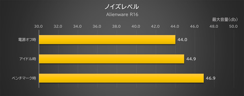 ノイズレベルはAurora R16本体の斜め前方、30cm離れた地点にマイク先端が来るようにして計測した。PC本体をデスクの上に置いたときの、ユーザーの耳の位置を想定したポジションだ。Alienware Command Centerの「パフォーマンス」モード設定では比較的冷却ファンが稼働しやすいので、条件としてはどちらかというと不利ではある。