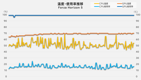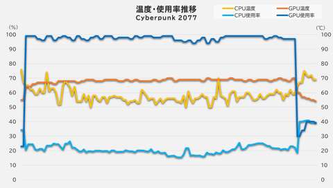 そして、ゲームを上記と同様の条件(画質は最高設定)で実行させながらCPUとGPUの温度・使用率を計測してみた結果が下記のグラフ。
