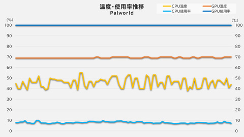 ゲーム中のCPU温度は概ね40~60℃で推移しており、GPUはほとんどフル稼働しながらも70℃以下で安定している。長時間プレイしていてもサーマルスロットリングによってパフォーマンスが低下するようなことは心配しなくても良さそうだ。