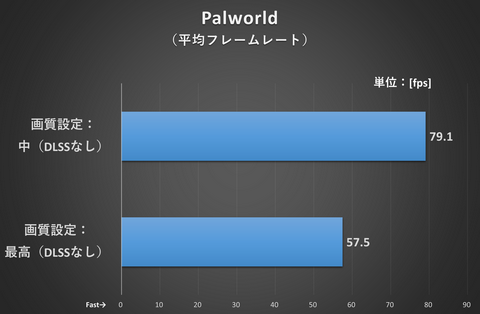 「Palworld」はベンチマークモードがないため、拠点付近を一定のルートで歩行したときのフレームレートを計測した。フレーム生成に対応していないことからほかのゲームのベンチマーク結果より低めに出ているものの、57.5fpsという数値はレスポンス的にもまったく不満なくプレイできるレベルだ。