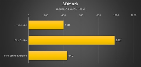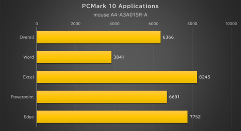 mouse A4の用途として考えられるのはあくまでも“軽作業”だ。下記のベンチマーク結果のグラフを見ると分かる通り、重い画像処理や3Dグラフィックスの描画には向いていない。しかし、ビジネス文書の作成/編集のようなタスクは実用上全く問題のないパフォーマンスを発揮してくれる。