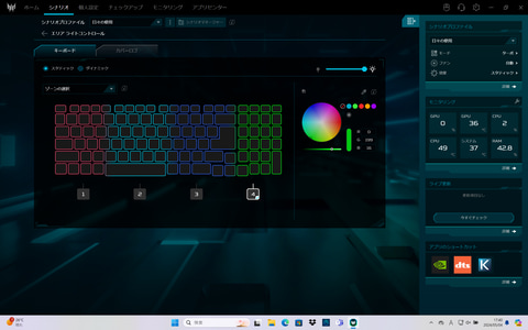 キーボードはテンキー付きの日本語配列。独自ユーティリティの「PredatorSense」でLEDの配色を任意に設定可能だ。