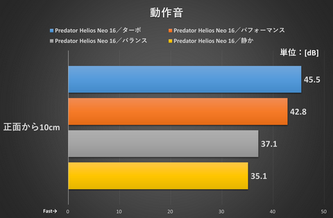 では、モード別で動作音はどう変わるのか。Predator Helios Neo 16の正面10cmの位置に騒音計を設置して、Cinebench 2024実行時の動作音を測定した。