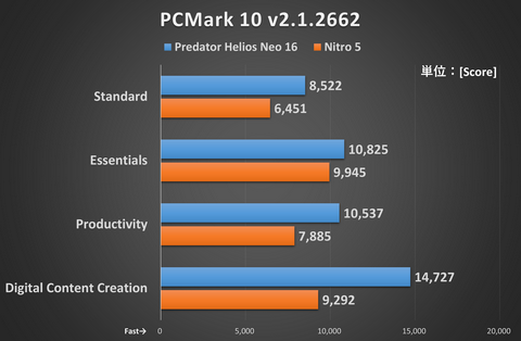 テストを実行するにあたり、比較用のNitro 5が画面比率16:9のフルHD(1,920×1,080ドット)なのでそれを基準にするが、Predator Helios Neo 16は画面比率が16:10のWQXGA(2,560×1,600ドット)を採用している。