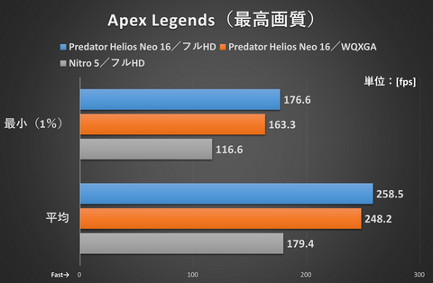 Apex Legendsは、フルHDで平均258.5fps、WUXGAで平均248.2fpsと最高画質でも高いフレームレートを出した。Predator Helios Neo 16は240Hzの高リフレッシュレート液晶を採用しているが、それを生かし切れるだけのフレームレートになっている。アップスケーラーやフレーム生成を使わない“素”の性能でも、GeForce RTX 4070 Laptop GPUは十分高性能と言ってよいだろう。
