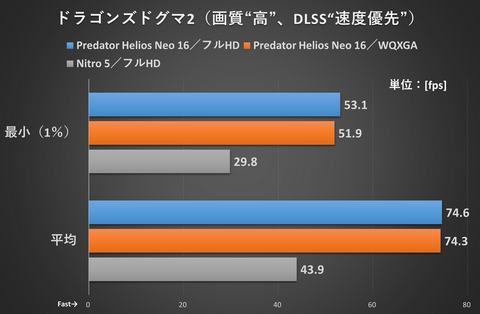 ドラゴンズドグマ2は、現状アップスケーラーだけのDLSS 2までの対応。それでもNitro 5よりも約1.7倍のフレームレートを達成。平均74fps台と快適なプレイの目安と言える平均60fspを大きく超えた。将来的にはフレーム生成が可能なDLSS 3に対応予定となっており、そうなればフレームレートの差はもっと大きくなるだろう。