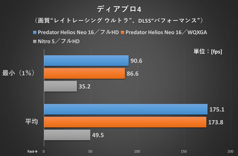 その一方でPredator Helios Neo 16は、どちらも平均120fps以上を達成。レイトレーシングの美しさをなめらかな描画で楽しめる。たった1世代でも、GPUの性能と機能差が大きいことが分かる結果だ。