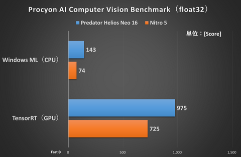 Procyon AI Computer Vision BenchmarkのWindows MLはCPUを使ってAI処理を実行している。コア数の差が大きく、Predator Helios Neo 16のほうが約1.9倍もスコアが高くなった。