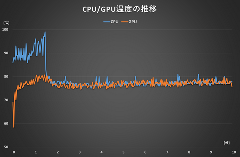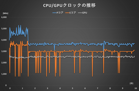 CPUクロックは、1分半まではPコアが4.5GHz、Eコアが3.5GHz前後、その後はPコアが3.5GHz前後、Eコアが3GHz前後で推移となった。温度の推移を見れば分かるが、CPU温度が高くなったのでクロックを少し落としたということだろう。