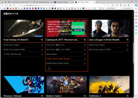 BenQ側としては「メーカーお仕着せのゲーム画質モードだけでは不充分」と考えているようで、ゲーム関連コミュニティと太いパイプを持つBenQらしい「ユニークな試み」も提供している。それが「Color Shuttle」機能だ。
