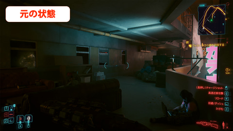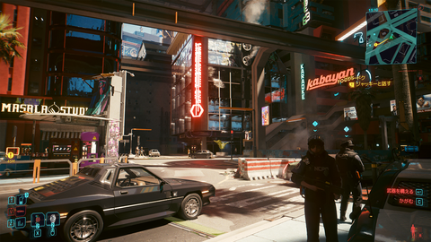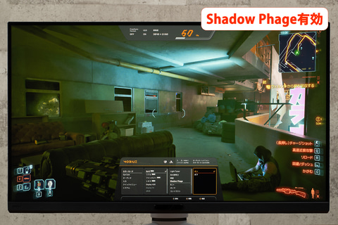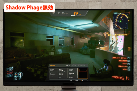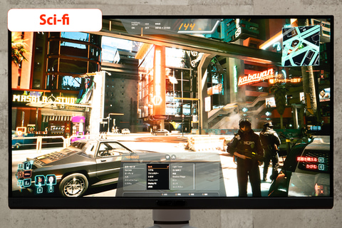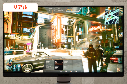 続いて、発色表現を見るべく、「サイバーパンク2077」をプレイ。画質モードは「DisplayHDR」を選択(本節の評価では、すべてこのモードを選択)。このゲームは、舞台となる未来都市「ナイトシティ」の煌めく情景が、非常にHDR映えするのだが、 さすがは量子ドット技術採用機だけあり、本機EX321UXが描き出す街並みは圧巻。特に、街中を彩るネオンサインの純色・原色表現が鮮烈であった。