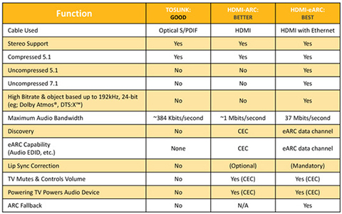 「旧式のARC」と「HDMI 2.1世代のeARC」、両者の違いは主に伝送できる音像フォーマットの多さ、正確には伝送できるビットレートの違いにある。最新のDolby AtmosやDTS:Xといったサラウンド形式はeARCでしか伝送ができない。「旧式のARC」ではDolby Digital/DTS/AACといった、DVD時代のサラウンドにしか対応できないのだ。